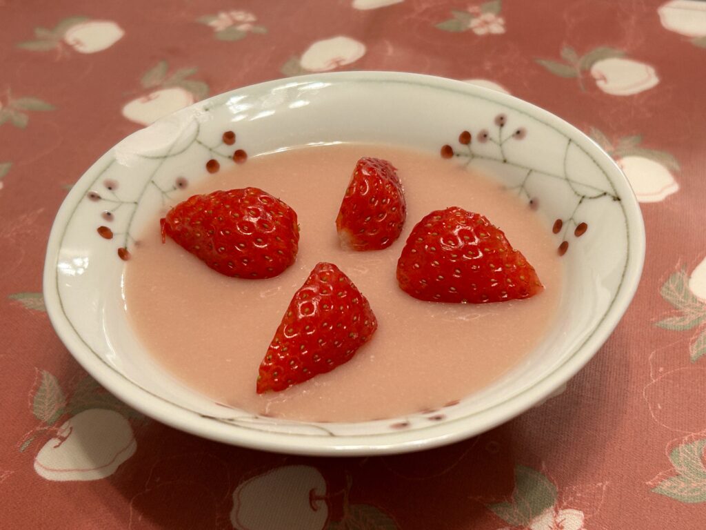 上記の写真は、私が自分で作って食べた「いちご杏仁豆腐」です。白い器に収まった淡いピンク色の生地を作り上げたときは、私自身も見ていて甘く幸せな気分になりました。詳しいレシピに興味がある方は、【いちご杏仁豆腐の作り方】の記事もぜひご参照ください。